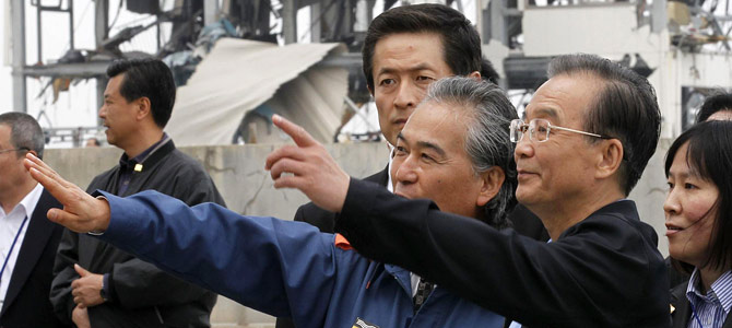 Chinese Premier Wen Jiabao (C, front) visits the area damaged by the March 11 earthquake and tsunami in Natori city, Japan, May 21, 2011.