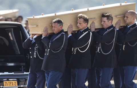 Victims of the Malaysian jetliner shot down over Ukraine returned at last Wednesday to Dutch soil in 40 wooden coffins, solemnly and gently carried to 40 identical hearses, flags at half-staff flapping in the wind.