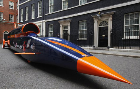 Prime Minister David Cameron greets British Royal Air Force Wing Commander Andy Green to view the Bloodhound Super Sonic Car at Downing Street on June 24, 2013 in London, England.