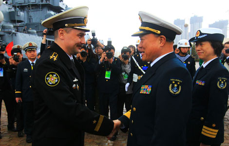 Chinese and Russian warships gathered at the eastern Chinese harbor of Qingdao Saturday to prepare for a joint exercise, slated for April 22-27 in the Yellow Sea.