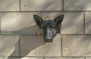 An 8-month-old German Shepherd is shown stuck in a hole in an 18-inch block wall in Desert Hot Springs, California Dec 27, 2010 in this photograph released by the Riverside County Animal Services December 27, 2010.
