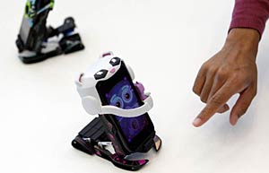 Matt Hershenson (R), engineering director of hardware, and Anand Agarawala (C), product manager, demonstrate Android's connectively possibilities with a stationary bike during the Google IO Developers Conference in the Moscone Center in San Francisco, California, May 10, 2011.