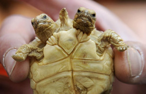 An African spurred tortoise (Geochelone sulcata) with two heads and five legs is displayed in Zilina March 7, 2011. The two-headed tortoise, which has been given the two names Magda (left head) and Lenka, is seven weeks old and was born in Slovakia.