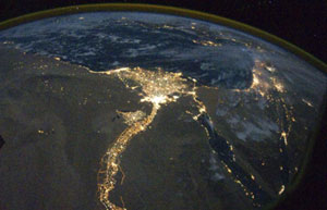 A night time photograph made by an International Space Station Expedition 25 crewmember shows the bright lights of Cairo and Alexandria, Egypt on the Mediterranean coast as well as the Nile River and its delta which stand out clearly in this image released by NASA and taken October 28, 2010.[