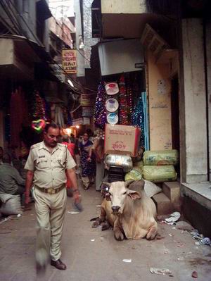 瓦倫納西老城的巷子可以用臟,亂,臭,擠來形容,地面上到處都是人和動物的糞便;流浪的狗狗睡在路邊,從它身邊經過,他居然沒有一點反應,跟死了一般;巨大的牛牛橫七豎八的躺在本來就小的街道上,讓我一度只有從它們身體的縫隙間緩慢挪動;街道兩邊蹲坐著很多瘦小的男人,他們嘴里咀嚼著一種葉子,朝我的腳上吐出紅紅的唾液,然后若無其事的繼續咀嚼著;時不時有出來到夜壺的婦女,她們頭頂夜壺,用極其大的聲音叫著我根本聽不懂的語言,我覺得她們好象在抗議我擋住了她們的去路;身邊還有一堆年輕瘦小的男子,重復的說著那幾句英文,讓我去他們開的旅店入住……