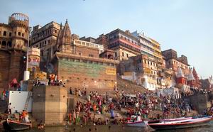 八點的瓦倫納西太陽已經高照,如果說在德里的42度算熱的話,那么這里的持續49度的高溫簡直就是太熱了。套著塑料袋的雙腳被地面燙的有點難以走動,用最快的速度找了一個三輪摩的就向瓦倫納西的老城駛去。