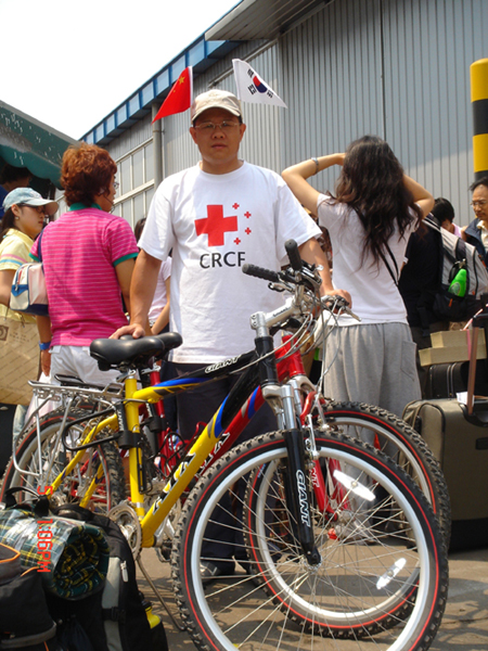 天仁號經過二十六個小時的航行,6月5日韓國時間下午2點到達仁川港,開始了我國外的旅程。出關非常地不順利,韓國海關關員說這是中國人第一次以騎自行車的方式到韓國,而且韓國沒有自行車道,騎車非常的危險等等。 另外,就經濟情況進行了詳細的訊問,幸虧在這方面我有充分的準備,隨身攜帶了中國銀行的資信證明,及相關證件,經過近一個小時的交流韓國海關關員終于蓋章放行。在出關物品檢查時,由于我攜帶了一些預防感冒咳嗽的藥品,復方甘草片是韓國限制進口的藥品不允許旅客攜帶。被韓國海關收繳。兩個小時后我才辦完出關手續,在這期間船上認識的一位韓國朋友幫我聯系好了韓國仁川紅十字會的工作人員接我,這位韓國朋友一直陪我辦完出關手續,為此他一直足足等了兩個小時。讓我非常感動。