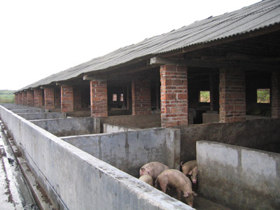 張興榮家兩個豬舍中的一個。豬舍是他父親十年前建的。和絕大多數(shù)其它農(nóng)村豬舍一樣,兩個豬舍離張家只有三十幾米的距離,而理想距離是五六百米。