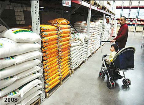 相比之下,2008年在北京山姆會員商店拍攝的這張彩色照片中我們可以看到:改革開放以來,中國市場上的大米供應已十分充足。從1978年到2006年,中國糧食年產量從3.05億噸增加到5億噸,增幅約60%。