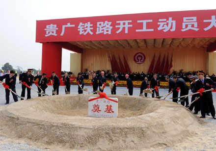 10月13日,來賓為貴廣快速鐵路動工興建奠基。 當日,貴廣快速鐵路動工儀式在廣西桂林舉行。貴陽至廣州快速鐵路是我國西北和西南地區連接“珠三角”的第一條時速在200公里的高標準鐵路,全長857公里,項目建設總工期為6年,項目投資估算總額為858億元,由鐵道部和貴州、廣西、廣東共同投資興建。(新華社 記者 陳瑞華 攝)