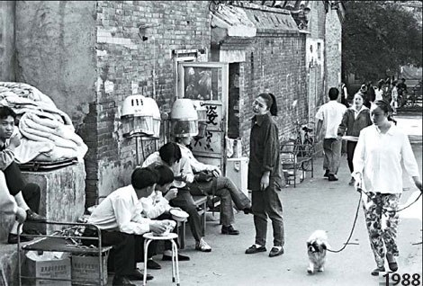 這張王文瀾先生拍于1988年北京胡同的黑白照片就記錄了那個時候很常見的一種現象——在街邊理發。照片上的這個理發店外還有一些燙發的設備,它一定不是最寒酸的一個。
