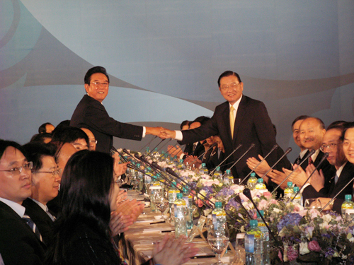 陳云林在致辭中說,這次兩會最高領(lǐng)導(dǎo)人在臺灣舉行會晤不僅是兩會成立以來的第一次,它也將成為兩岸關(guān)系改善發(fā)展的重要標志。