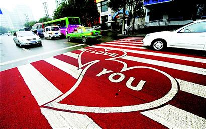 雖然被冠名為“愛情斑馬線”,但在外觀上和使用功能上,這條斑馬線并無特殊之處。交警三分局民警說,去年的七夕、國慶幾個大的節假日,人行道加上立錐筒,合江亭更添喜慶氣氛。“我們就考慮借用成都公交車專用道的紅色路面,讓這條斑馬線有一些改變。”年底,他們在網上查閱了一些國內外有特色的斑馬線作為借鑒,這才定下最終設計。