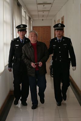 張克明戴上手銬,從臨時(shí)羈押室被帶上法庭。