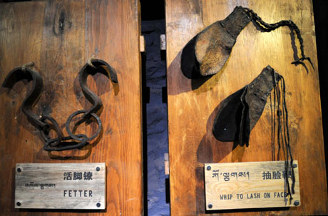 2009年3月23日 布達(dá)拉宮雪城監(jiān)獄舊址參觀者增多 這是雪城監(jiān)獄舊址內(nèi)保存的活腳鐐和抽臉皮(3月21日攝) 。 隨著3月28日首個“西藏百萬農(nóng)奴解放紀(jì)念日”的臨近,位于拉薩布達(dá)拉宮腳下的雪城監(jiān)獄舊址參觀人數(shù)逐漸增多。人們通過參觀舊址內(nèi)展出的大量實物、圖片和雕塑,可了解舊西藏封建農(nóng)奴制度的黑暗和農(nóng)奴們的苦難經(jīng)歷。 據(jù)介紹,作為舊西藏拉薩兩大監(jiān)獄之一的雪城監(jiān)獄刑具繁多、刑法嚴(yán)酷。用來懲罰囚犯的刑具有25種之多,包括手銬、腳鐐、石帽、竹簽、剁手腳的刀子、挖眼的鐵勺、站籠、皮鞭、木枷等,許多無辜的生命曾慘死在這里。雪城監(jiān)獄經(jīng)復(fù)原后于2007年對外開放。 新華社記者 覺果 攝