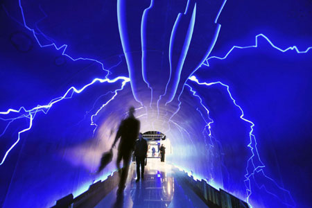 3月23日,參觀者從杭州市氣象科普體驗館“雷電通道”走過,身臨其境感受雷電的威力。 當天是世界氣象日,浙江省杭州市氣象科普體驗館正式開館。參觀者在這里可以了解氣象文化、氣象科普知識、重大氣象災害事件,并親身體驗與氣象有關的互動項目。 新華社發(fā)(李忠 攝)