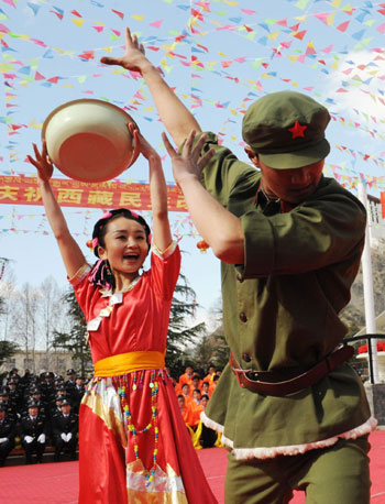 3月26日,群眾在表演舞蹈《洗衣歌》。 當(dāng)日,拉薩各族各界群眾舉行首場“紅色歌曲”演唱會,慶祝首個“西藏百萬農(nóng)奴解放紀(jì)念日”的到來。 新華社記者 覺果攝