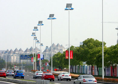 5月4日,車輛行駛在蘇州工業園區星港街上。近日,蘇州工業園區星港街完成改造,道路兩側244套太陽能路燈投入使用,從而成為蘇州市區首條綠色環保的全太陽能路燈街。新華社發(王建中攝)