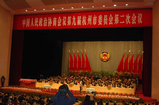 杭州市政協九屆二次會議開幕式 今年杭州市政協九屆二次會議邀請杭州市民列席旁聽市政協全會.拓寬了民主渠道,豐富了民主形式,使反映民意的路子更廣,是擴大公民有序參政的好舉措!