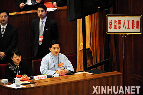 3月15日,十一屆全國(guó)人大一次會(huì)議在北京人民大會(huì)堂舉行第五次全體會(huì)議,選舉第十一屆全國(guó)人民代表大會(huì)常務(wù)委員會(huì)委員長(zhǎng)、副委員長(zhǎng)、秘書長(zhǎng);選舉第十一屆全國(guó)人民代表大會(huì)常務(wù)委員會(huì)委員;選舉中華人民共和國(guó)主席、副主席;選舉中華人民共和國(guó)中央軍事委員會(huì)主席。這是總監(jiān)票人工作席。新華社記者王建華攝 |