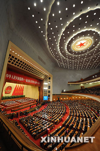 3月15日,十一屆全國人大一次會議在北京人民大會堂舉行第五次全體會議,選舉第十一屆全國人民代表大會常務委員會委員長、副委員長、秘書長;選舉第十一屆全國人民代表大會常務委員會委員;選舉中華人民共和國主席、副主席;選舉中華人民共和國中央軍事委員會主席。這是大會會場。新華社記者 楊宗友 攝