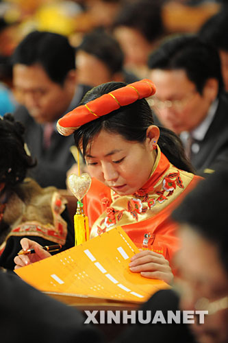 3月15日,十一屆全國人大一次會議在北京人民大會堂舉行第五次全體會議,選舉第十一屆全國人民代表大會常務委員會委員長、副委員長、秘書長;選舉第十一屆全國人民代表大會常務委員會委員;選舉中華人民共和國主席、副主席;選舉中華人民共和國中央軍事委員會主席。這是一位代表在查看選票。新華社記者馬占成攝