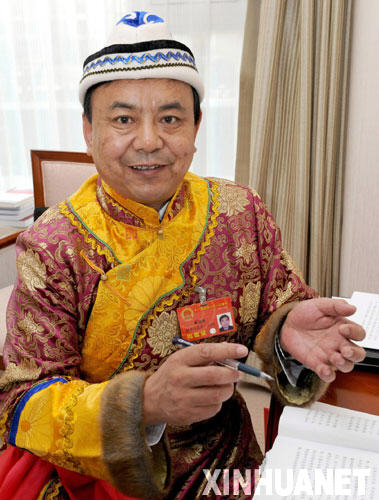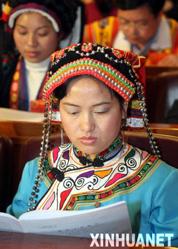這是來自貴州的全國人大代表陳萍(彝族)在十一屆全國人大一次會議開幕會上。 新華社記者王建民攝
