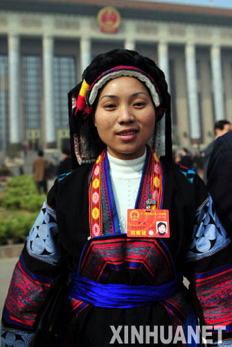 3月10日,來自貴州的全國人大代表羅濤(布依族)在北京人民大會堂前。 新華社記者劉泉龍攝