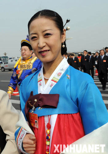 這是來自吉林省的全國人大代表咸順女(朝鮮族)走向人民大會堂。 新華社記者楊宗友攝