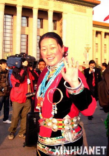 這是來(lái)自西藏的全國(guó)人大代表曉紅(珞巴族)在北京人民大會(huì)堂前。 新華社記者賈立君攝