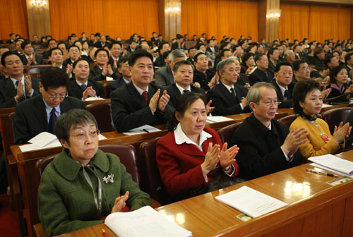 3月3日,中國人民政治協(xié)商會議第十一屆全國委員會第二次會議在北京人民大會堂開幕。這是全國政協(xié)委員在認真聽會,其中前排左一為中國日報社常務副總編輯黃慶。 (新華社記者 劉衛(wèi)兵 攝)
