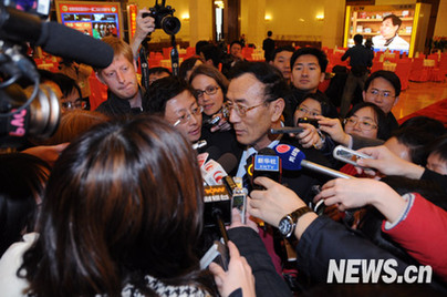 3月5日,全國人大代表向巴平措被媒體記者團團圍住。當日,十一屆全國人大二次會議在人民大會堂開幕。新華網(wǎng) 文濤 攝