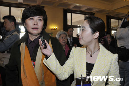 2009年3月5日,十一屆全國人大二次會議在北京人民大會堂開幕。圖為全國人大代表敬一丹接受新華網、中國政府網記者采訪。她說:“我有一些關于環境保護的建議。同時我作為一名電視人,我的欄目也關注就業、農民工和醫保問題。”陳濤攝