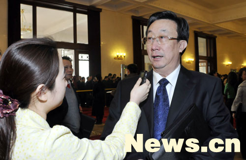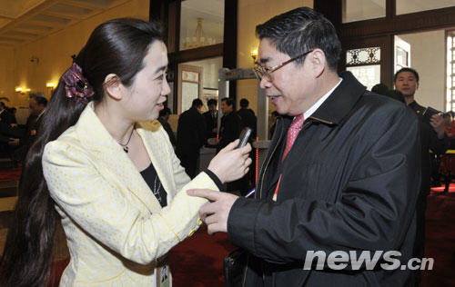 3月5日,十一屆全國人大二次會議在人民大會堂開幕。圖為全國人大代表、陜西省省長袁純清接受新華網記者采訪。陳濤 攝