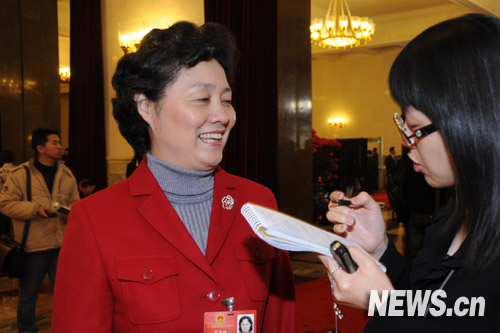 3月5日,十一屆全國人大二次會議在人民大會堂開幕。圖為全國人大代表蔣厚琳接受新華網記者采訪。文濤 攝