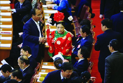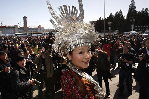 中國日報網中國在線消息:如往年一樣,人大會上,少數民族服飾總是記者鏡頭追逐的目標。